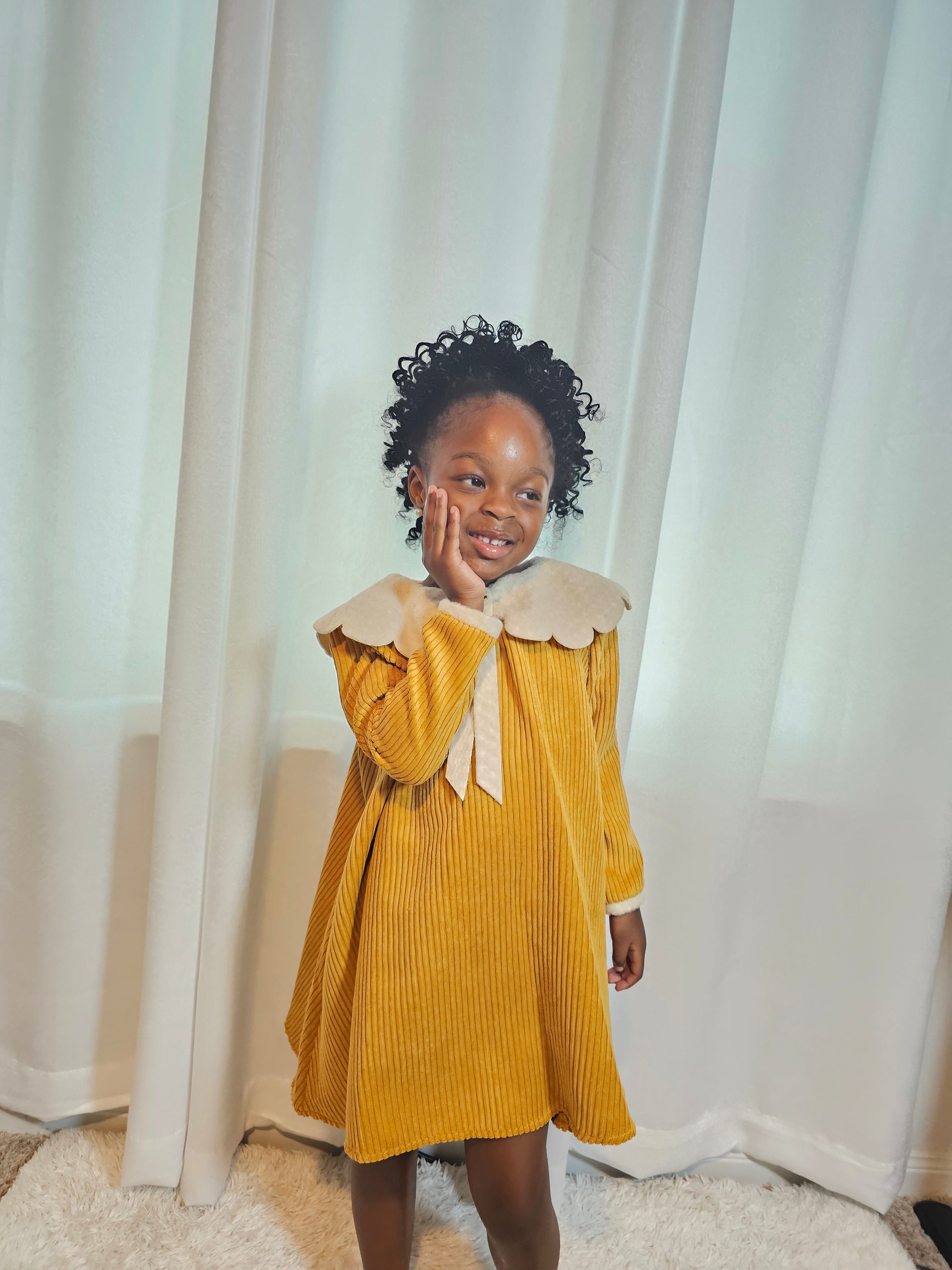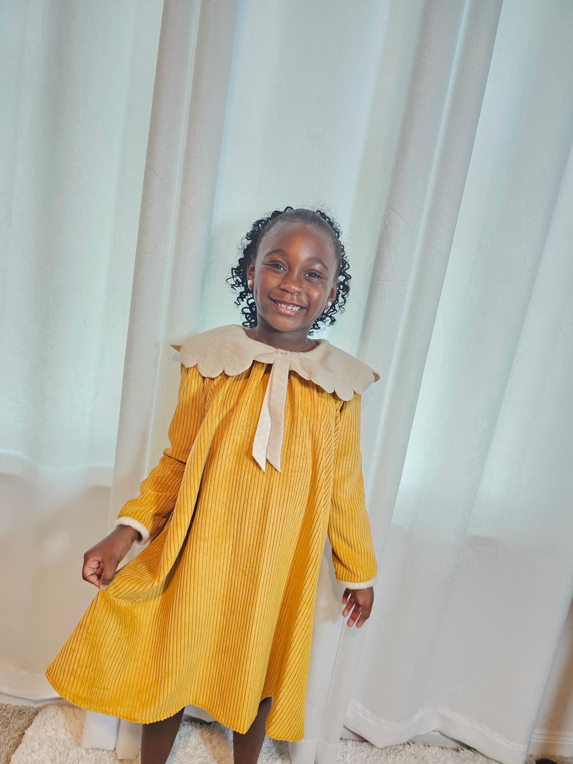 The Golden Daisy Corduroy Dress is crafted from soft, breathable corduroy in a warm golden hue, this dress blends comfort with classic style. The standout feature—a scalloped white Peter Pan collar with a delicate bow tie—adds a touch of vintage sweetness perfect for any occasion. Whether it’s a family gathering, school event, or a weekend outing, this dress keeps kids cozy while looking effortlessly adorable. Pair it with tights or ballet flats for a picture-perfect look .