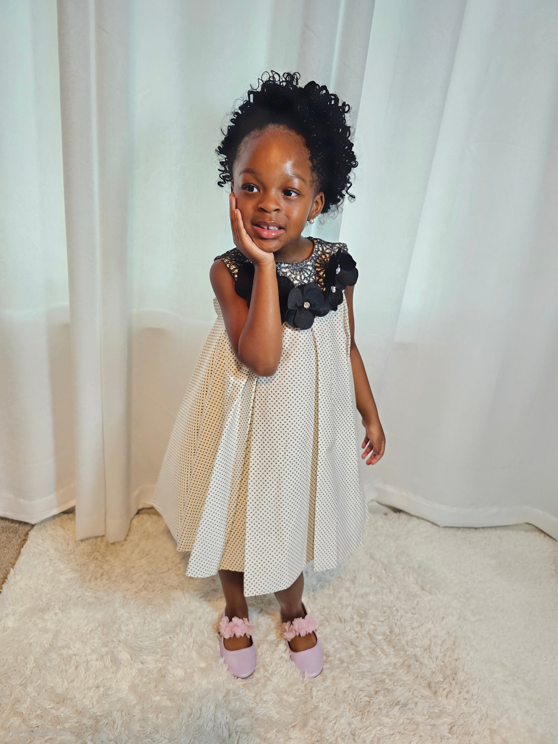 Step into a world of twirls and giggles with the Blossom Princess Dress! This charming A-line dress features a soft cream fabric sprinkled with tiny dots and a stunning black floral neckline that adds a touch of magic. Perfect for parties, picture days, or any moment that deserves a little sparkle, this dress flows beautifully with every move. Comfortable, stylish, and full of charm—just like every little princess who wears it!.